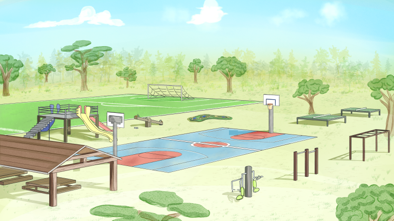 En complément du city stade et des agres, un stade de foot à 7, des tables de ping pong des équipements pour les plus jeunes (toboggan, bascules, circuits billes...) un auvent avec des tables pique-nique pour les familles ...